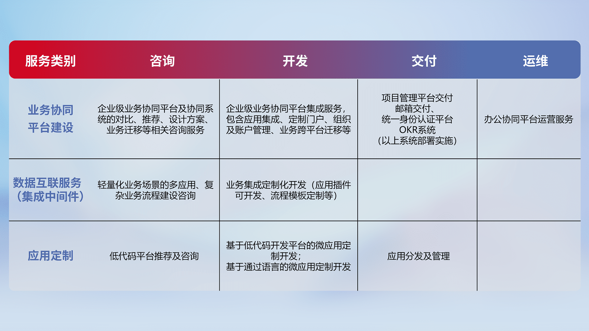 针对钉钉、、企微、、、IDaas等平台级产品提供产品的规划、、方案、、、、交付、、定制化开发等服务,,实现如统一协同办公、、智能客户服务、、混合会议管理、、、智能数据查询、、、、等业务场景,,实现数字化转型。。。。